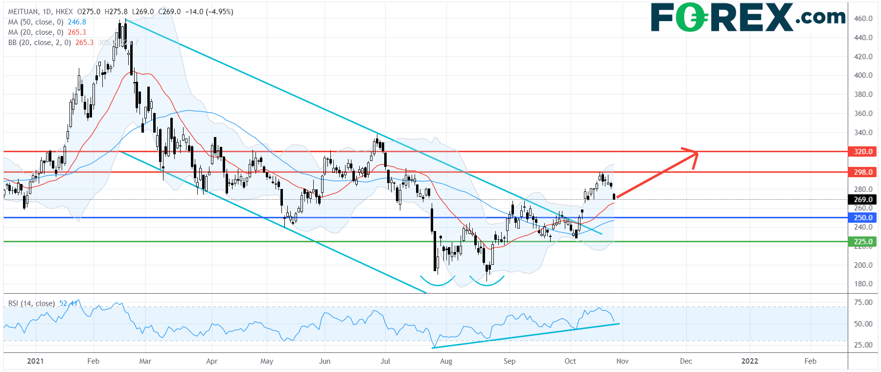 美团 (3690.HK):维持反弹走势,主要支持位250港元