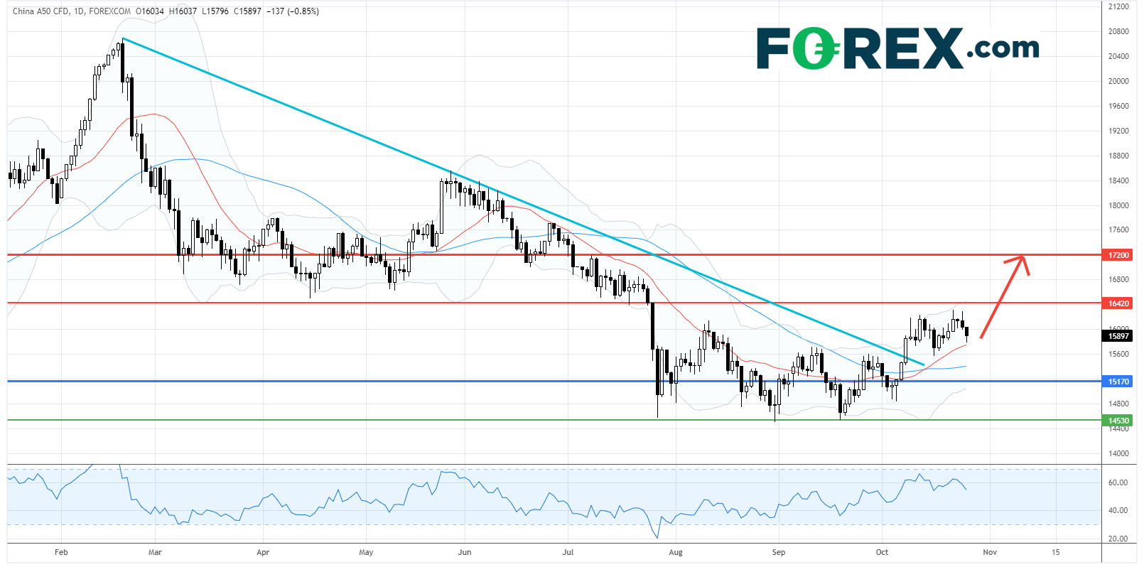 在日线图上,中国A50指数CFD上破了由今年高位拉出的下降趋势线。20日均线亦升破50日均线。技术格局显示走势正逐步看好。