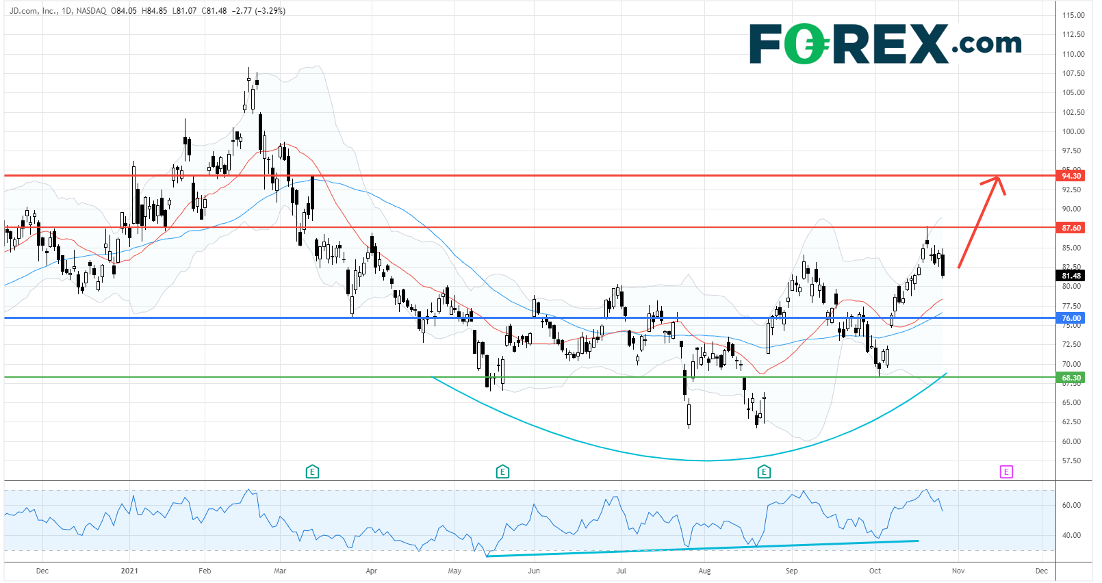 在日线图上,京东股价呈现一浪高于一浪的走势并升穿了9月高位84.20美元。目前,股价在上行的20均线和50日均线之上稍作整固。相对强弱指数亦处于买入区间。