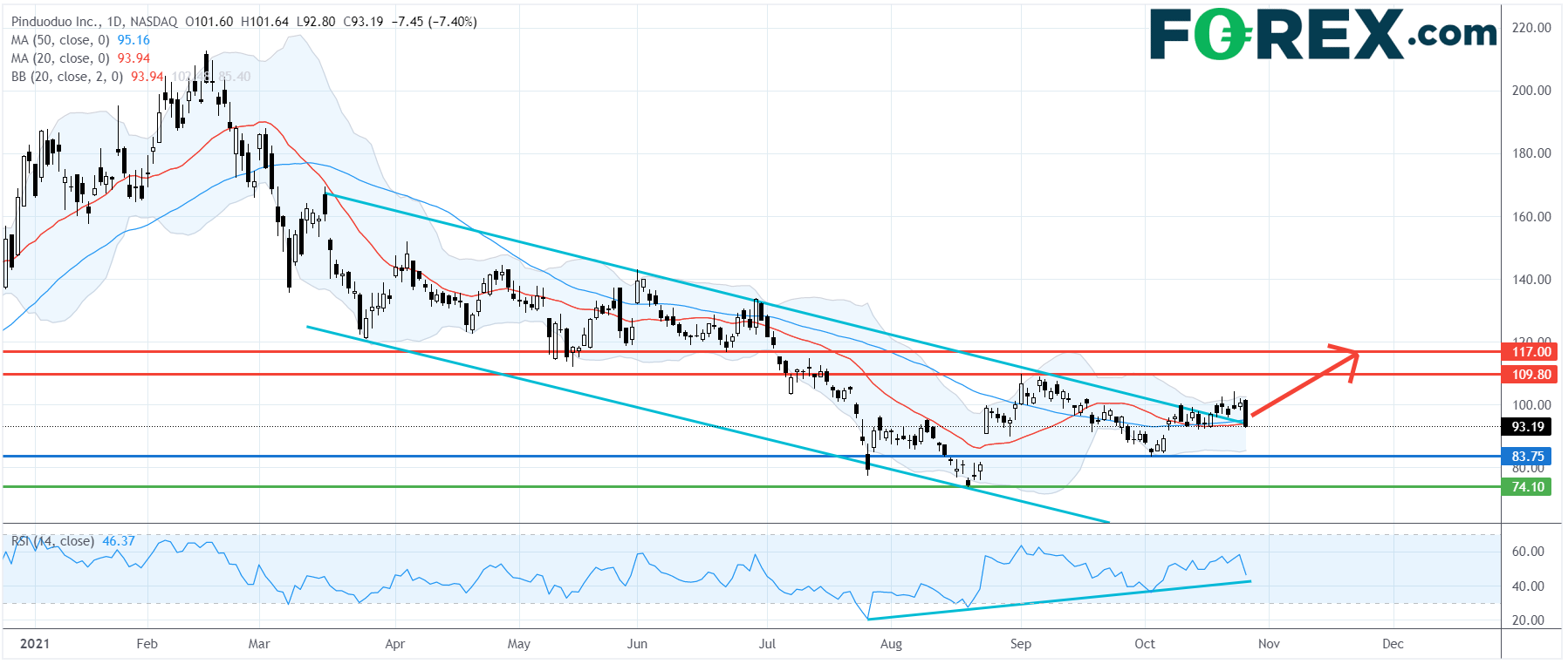 在日线图上,拼多多的技术走势呈现反转向上的初步迹象。此前,相对强弱指标出现看涨背离,目前它已上破3月以来的下降通道,并回到20日及50日移动均线附近。