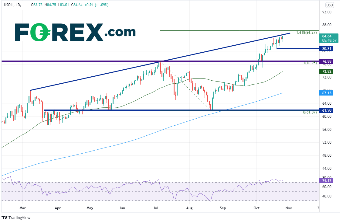 西得州原油日图自从8月23日在61.76附近创下短期低点后大举冲高,于10月25日在3月8日以来的上斜趋势线阻力处形成射日之星形态。该形态暗示反转。另请注意,RSI目前处于超买区域,也暗示反弹行情或准备回撤。支撑位在10月20日以来低点80.81、7月6日以来前高点76.88。短线阻力位在10月25日射日之星形态的高点85.39、7月6日高点到8月23日低点的161.8%扩展位,即86.27。