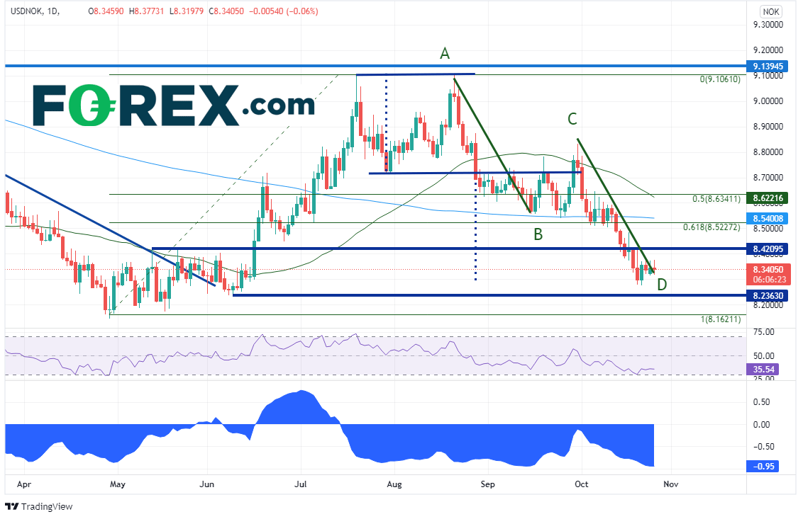 挪威的经济同样依赖原油,这样的现状和加拿大相似。所以,油价同样影响挪威克朗的走势。原油与美元/挪威克朗当前相关系数为-0.95,也是非常高的负相关系数。所以,在日图上交易的长期交易者同样可以用美元/挪威克朗替代对原油的交易。